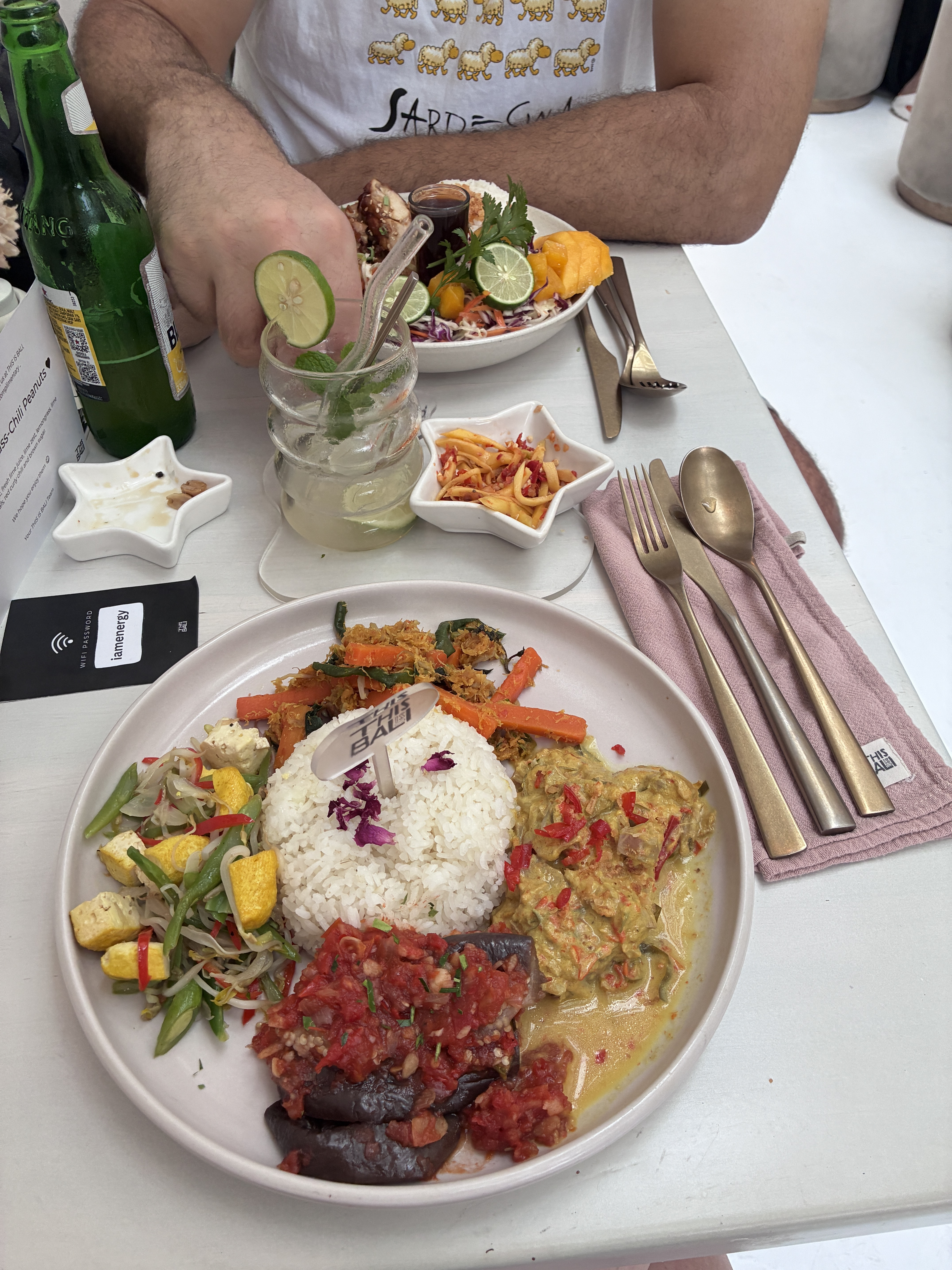 After some lounging around, we set off to eat. Once again, Zoli picked out a restaurant, which was another great choice – maybe I’ll hand over this task to him, two for two so far. It was called This is Bali, and we walked about 20 minutes to get there. It was Balinese food, but you could also assemble your own plate by using a template – actually three base options: white rice, red rice, or cauliflower rice. You had to stamp which toppings you wanted. It was incredibly delicious and also looked nice.