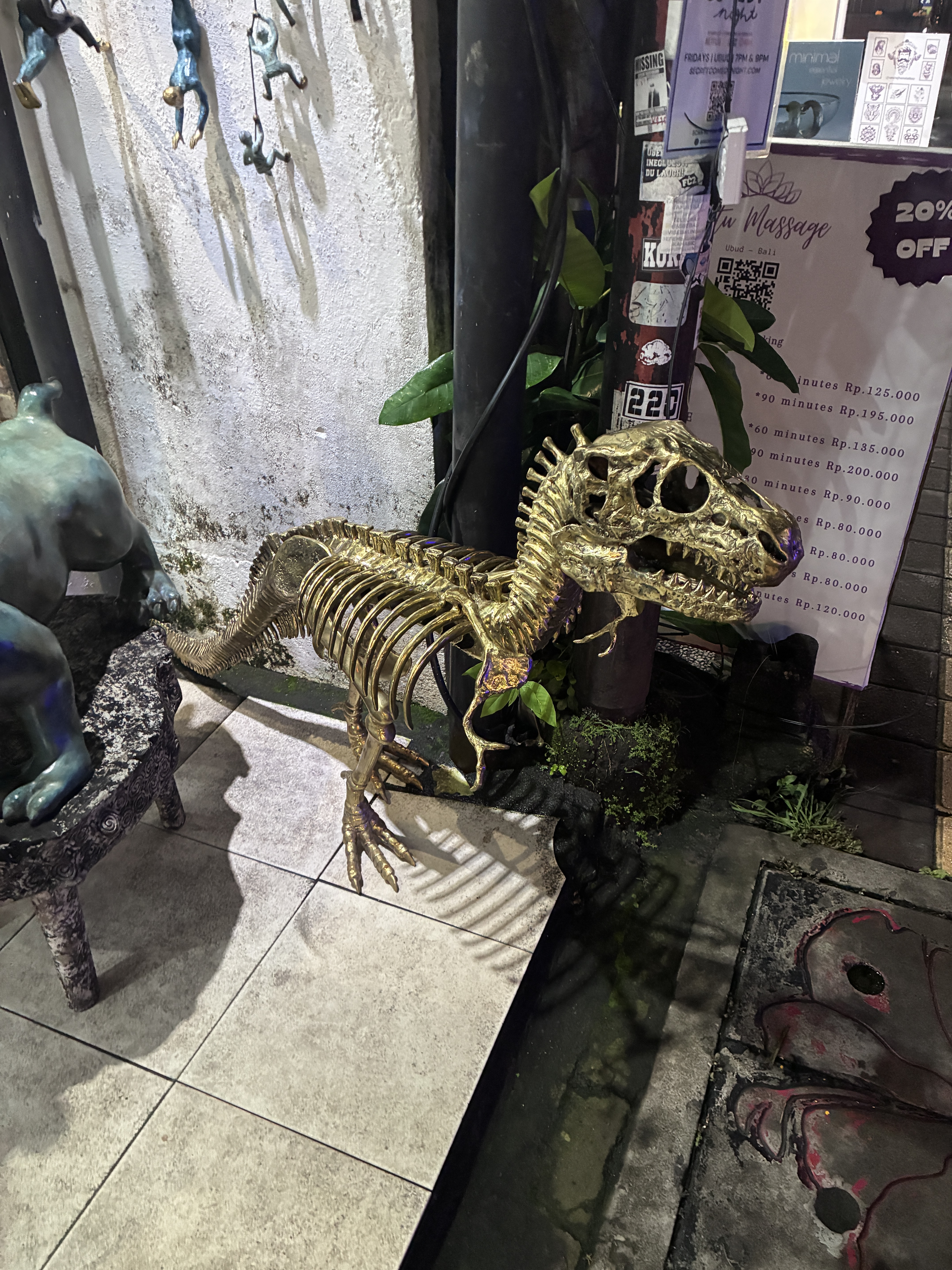 The shopping trip was successful; you can get pretty much anything here (e.g., a raptor skeleton statue), but we only scratched the surface with today’s walk. Ubud is quite intense for me at first – it’s like if I filled Angkor with very fancy Western-style restaurants and shops. We have a week here, so I’m curious to see what impression it will leave by the end. Zoli felt similarly about it after a few hours of today.